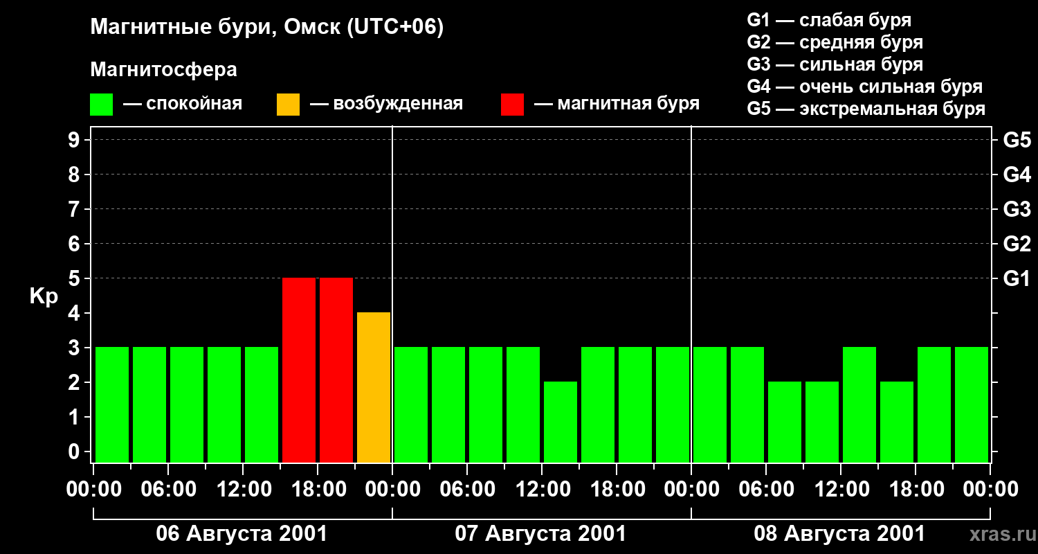 Изменения геомагнитного индекса Kp с 6 по 8 августа 2001 года для средних широт