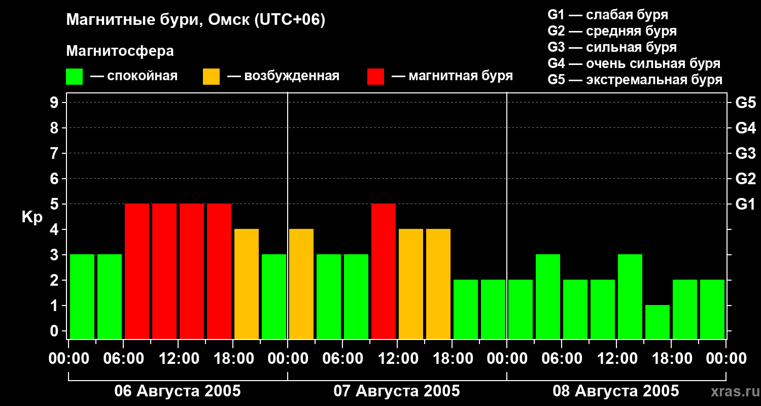 Изменения геомагнитного индекса Kp с 6 по 8 августа 2005 года для средних широт