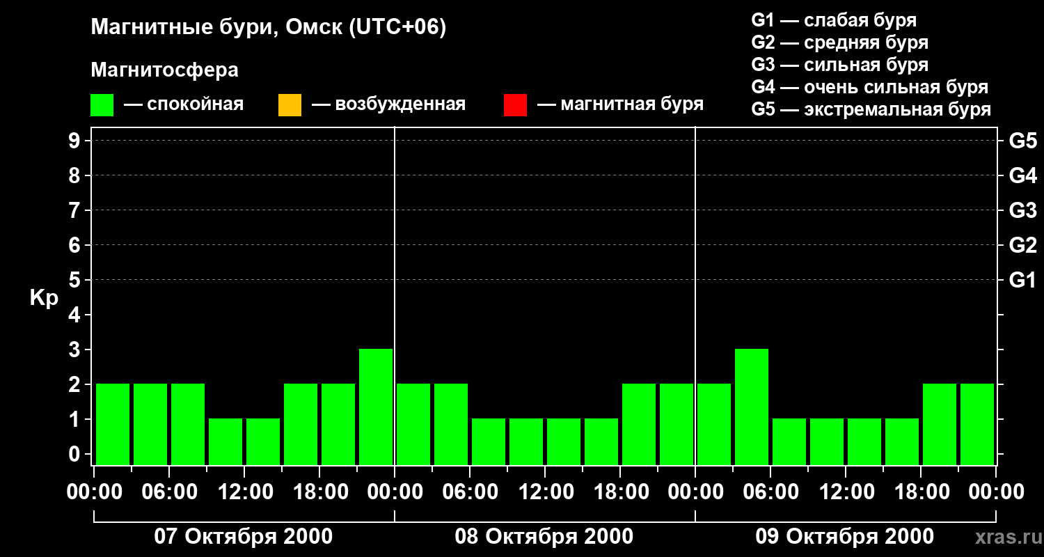 Изменения геомагнитного индекса Kp с 7 по 9 октября 2000 года для средних широт