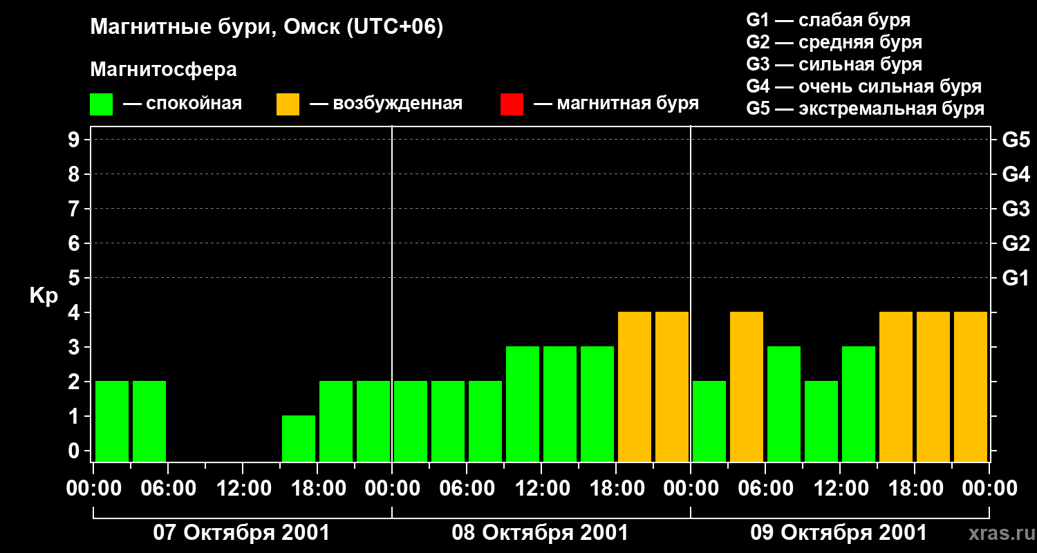 Изменения геомагнитного индекса Kp с 7 по 9 октября 2001 года для средних широт
