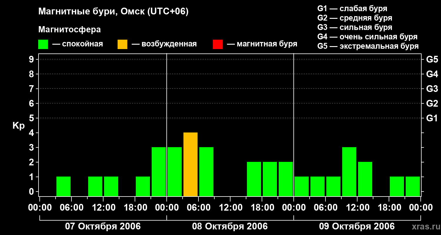 Изменения геомагнитного индекса Kp с 7 по 9 октября 2006 года для средних широт