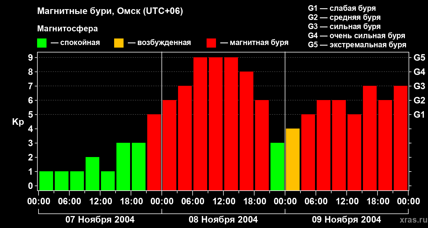Изменения геомагнитного индекса Kp с 7 по 9 ноября 2004 года для средних широт