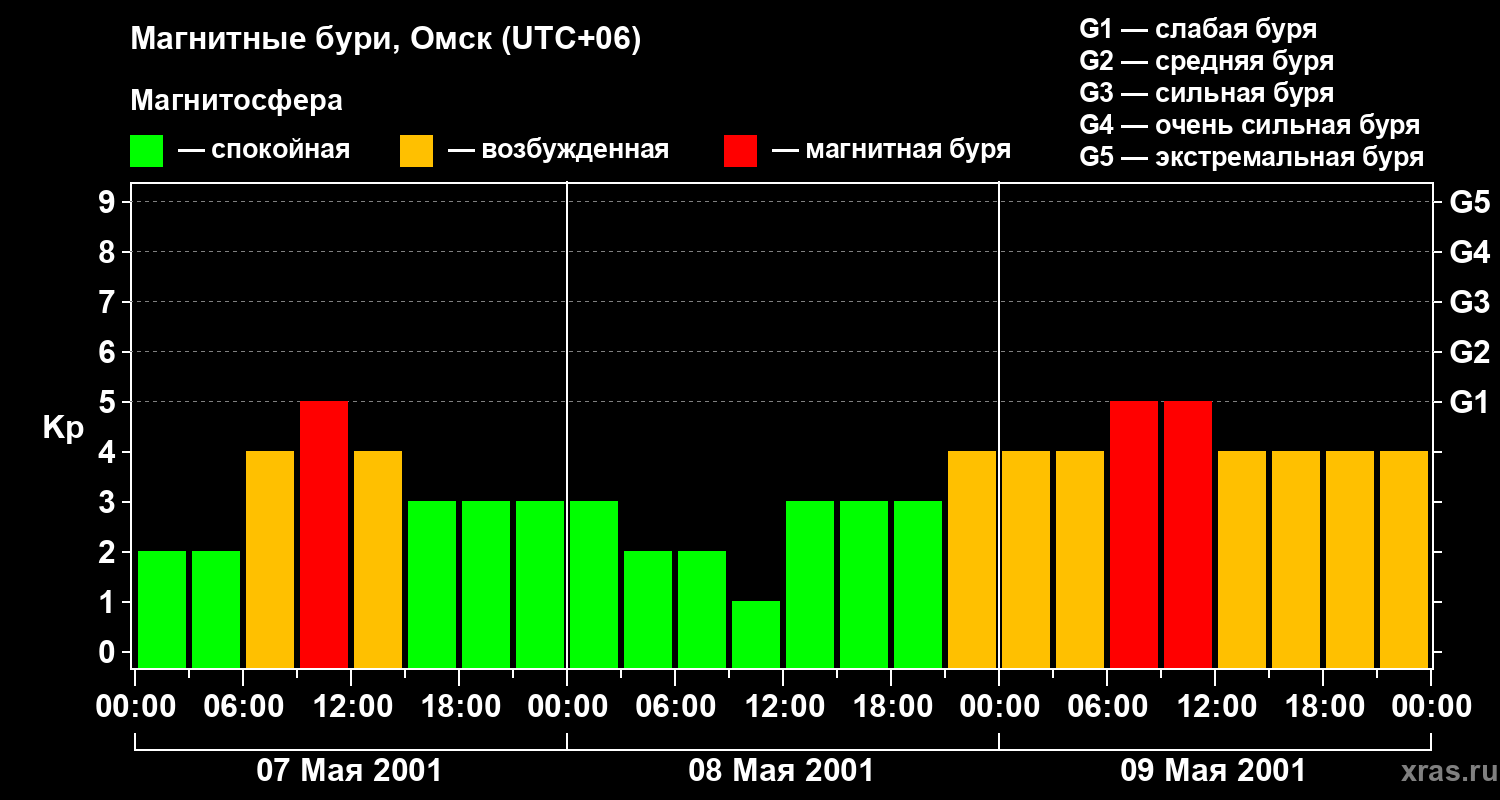 Изменения геомагнитного индекса Kp с 7 по 9 мая 2001 года для средних широт