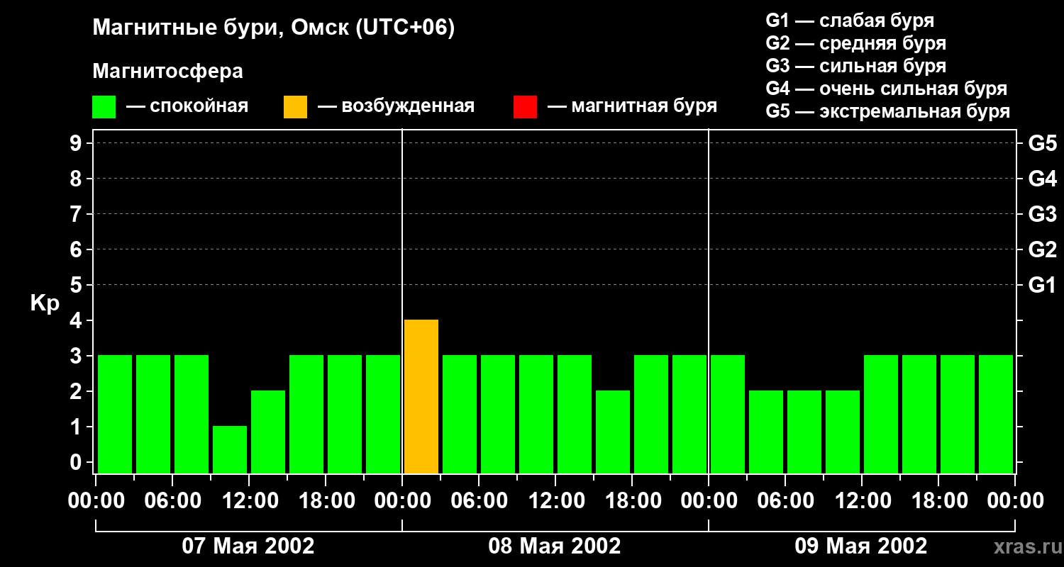 Изменения геомагнитного индекса Kp с 7 по 9 мая 2002 года для средних широт