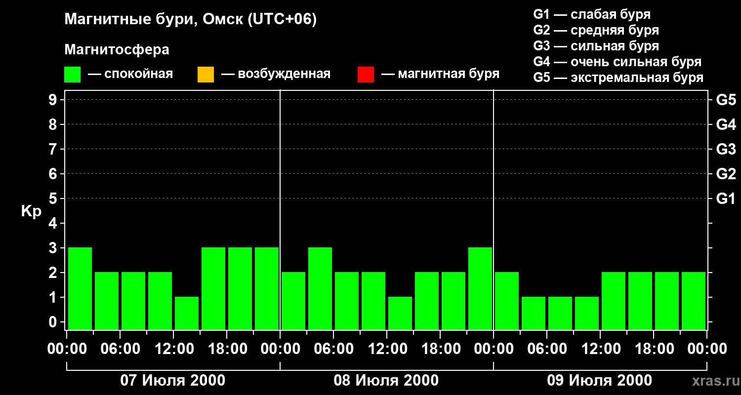 Изменения геомагнитного индекса Kp с 7 по 9 июля 2000 года для средних широт