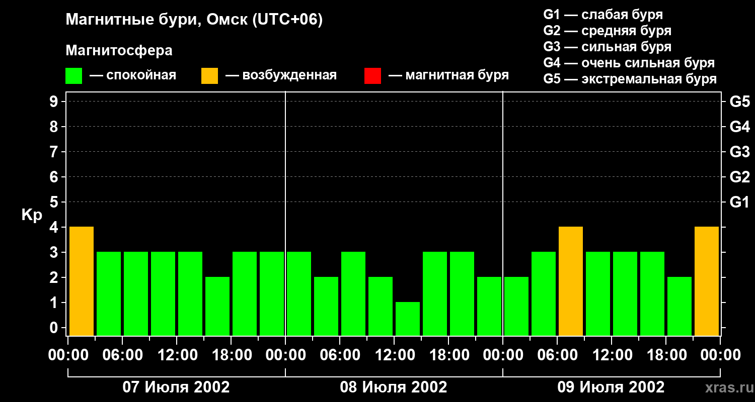 Изменения геомагнитного индекса Kp с 7 по 9 июля 2002 года для средних широт