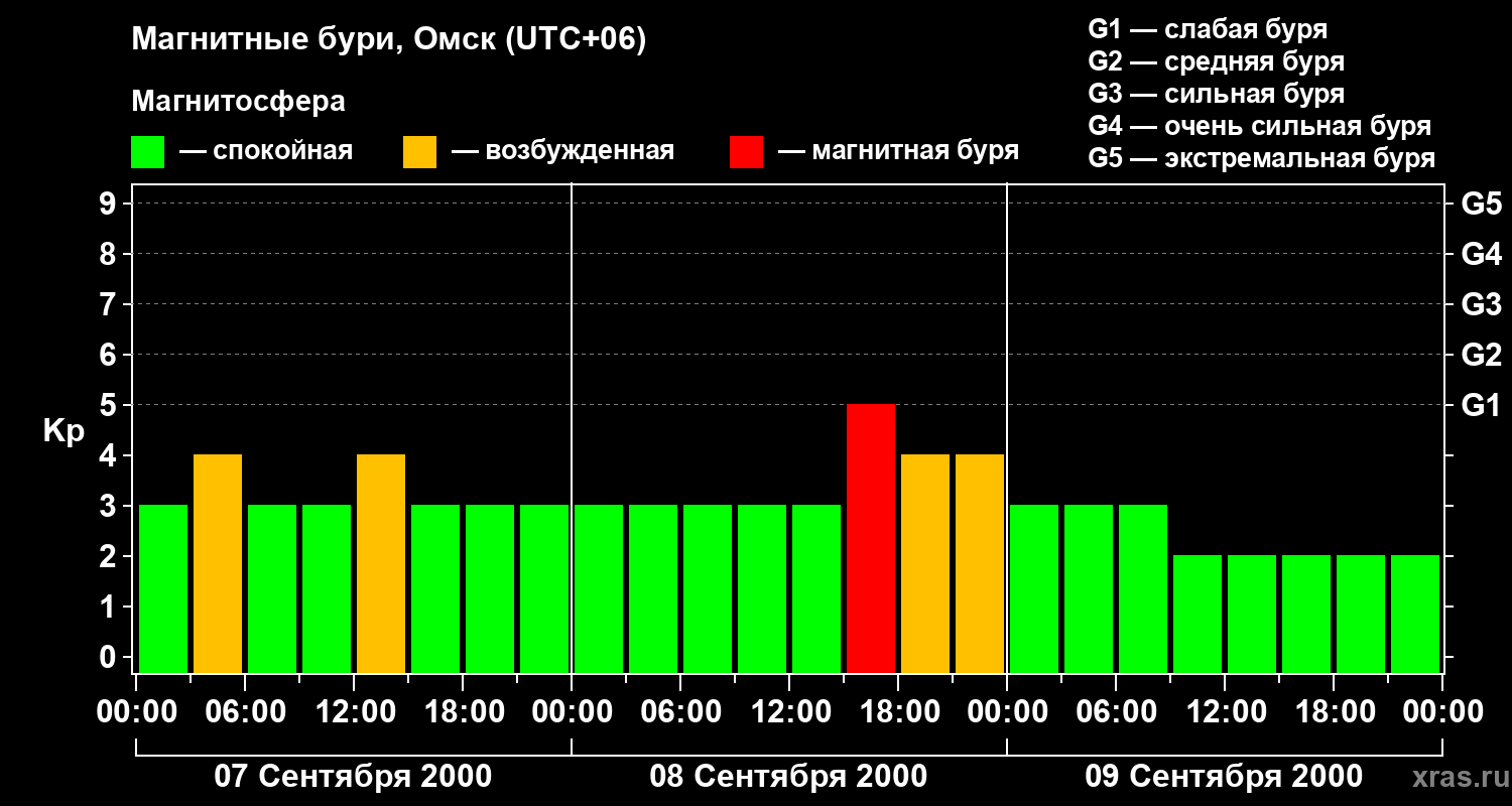 Изменения геомагнитного индекса Kp с 7 по 9 сентября 2000 года для средних широт