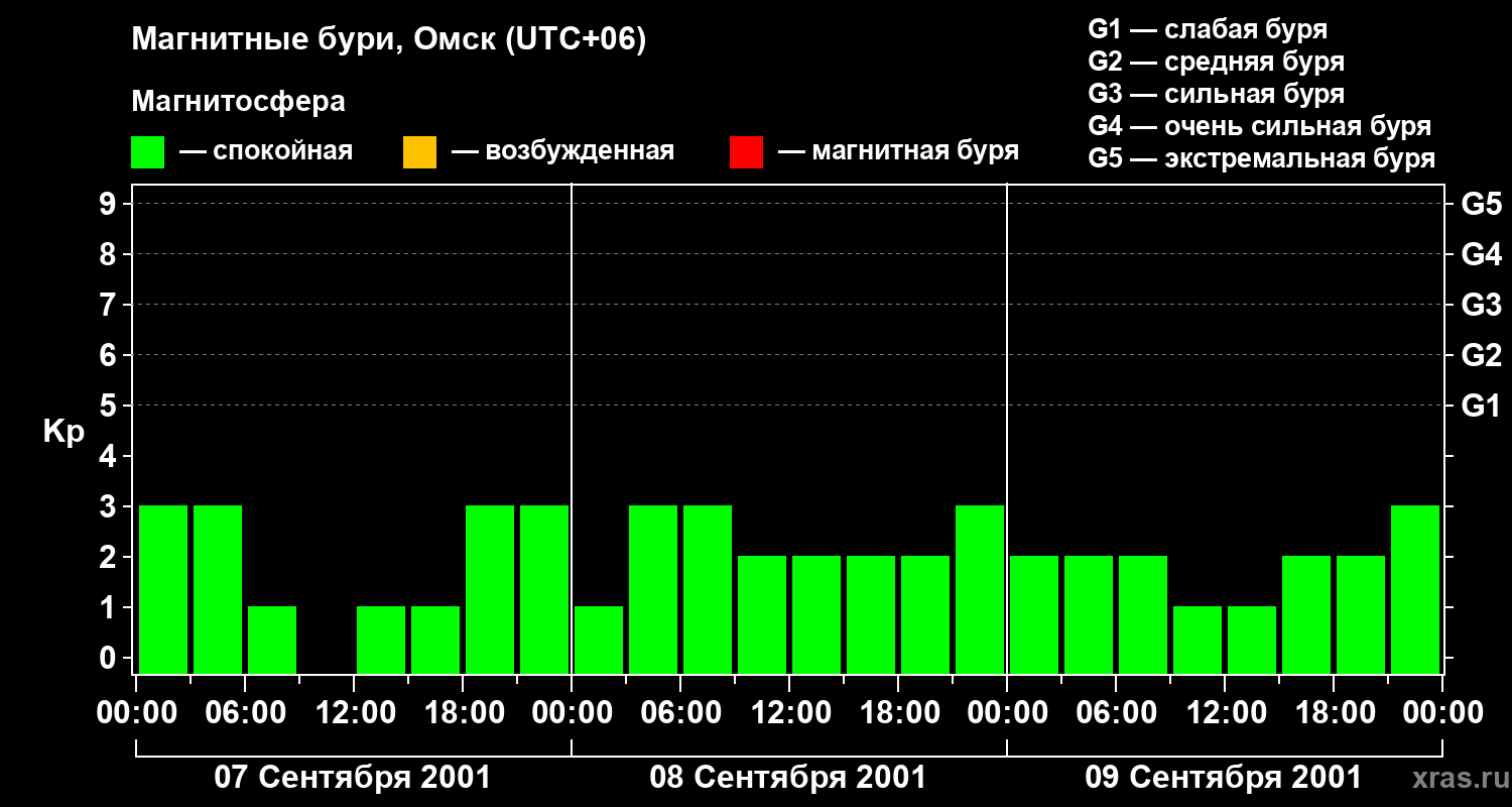 Изменения геомагнитного индекса Kp с 7 по 9 сентября 2001 года для средних широт