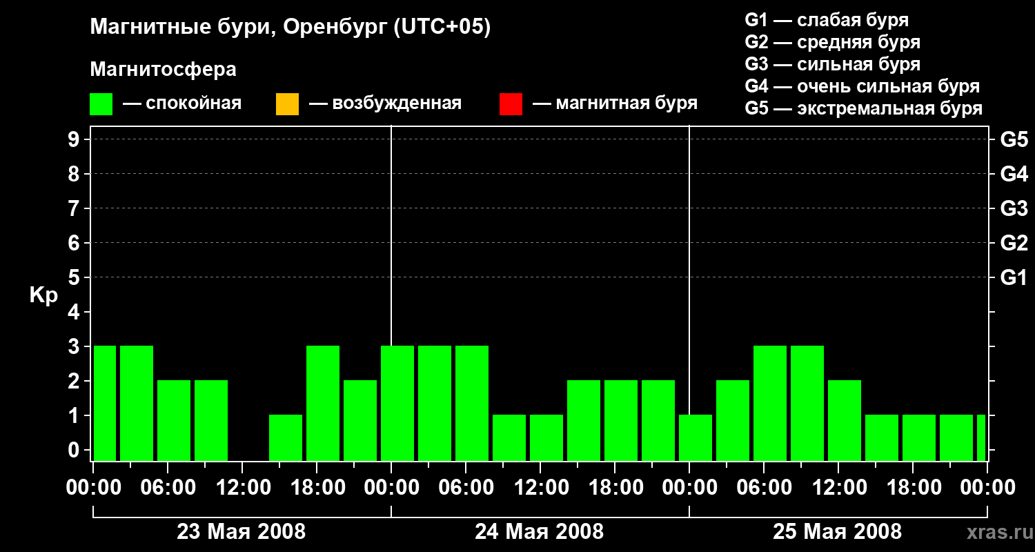 Изменения геомагнитного индекса Kp с 23 по 25 мая 2008 года для средних широт