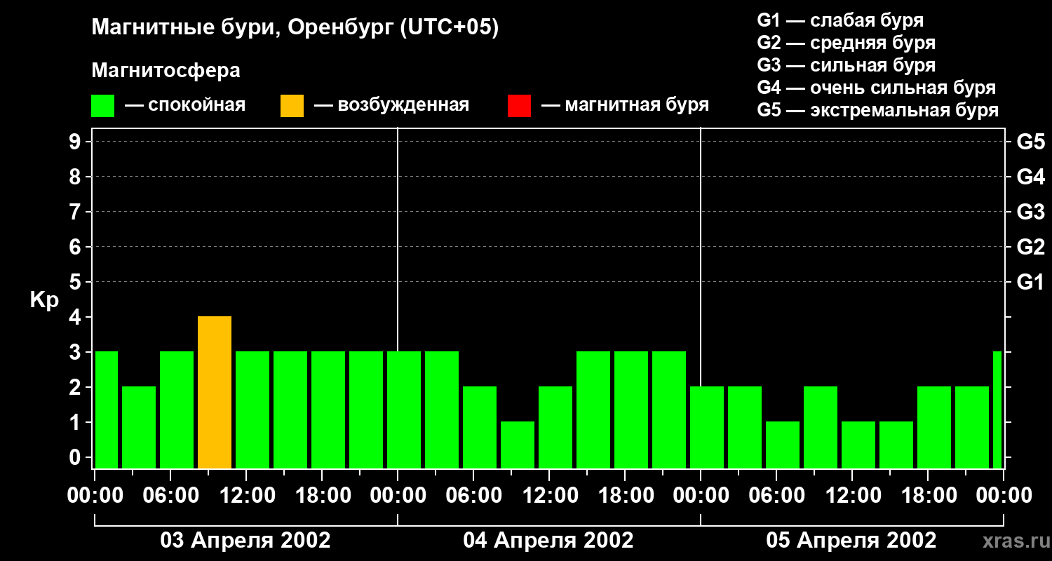 Изменения геомагнитного индекса Kp с 3 по 5 апреля 2002 года для средних широт