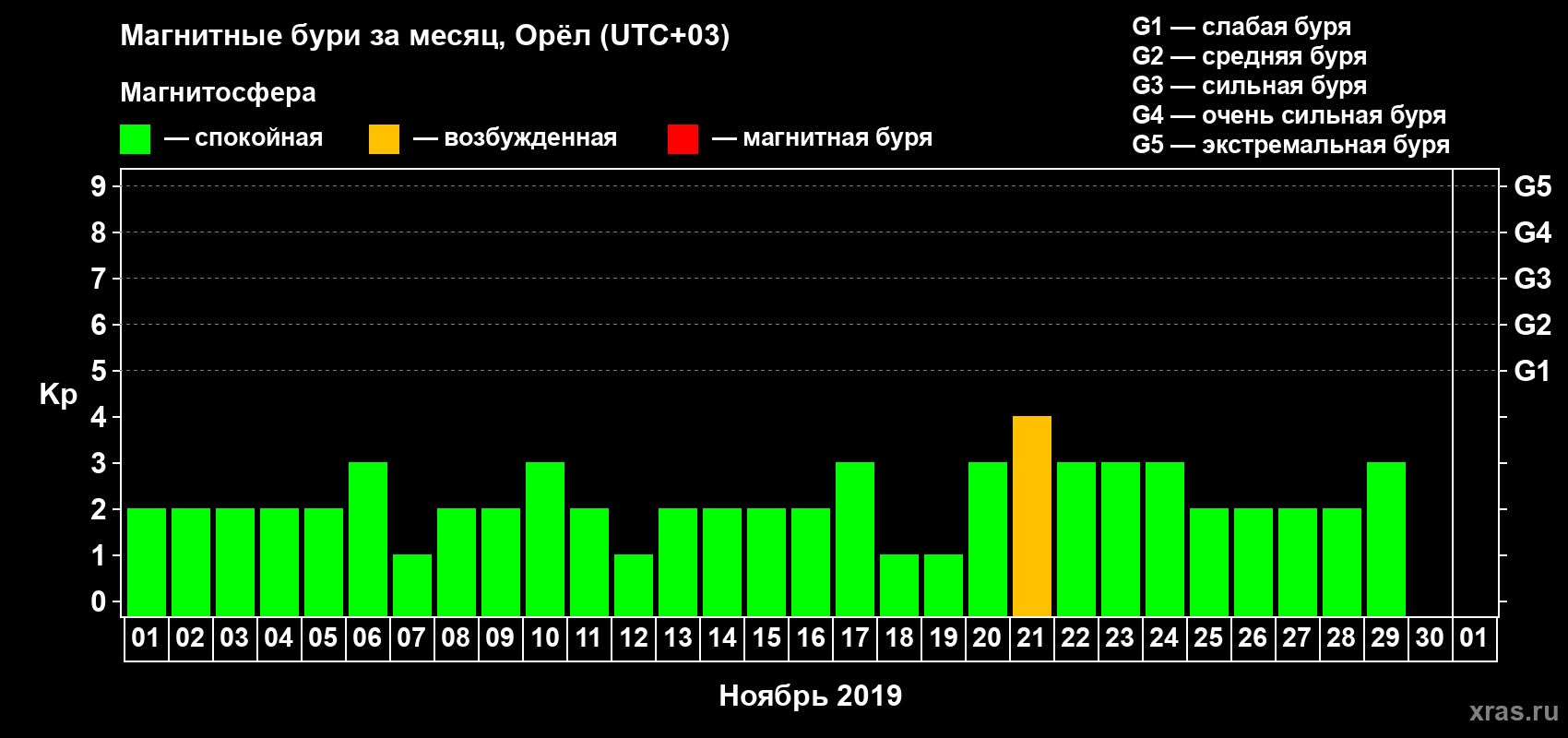 Изменения максимального суточного геомагнитного индекса Kp в ноябре 2019 года для средних широт