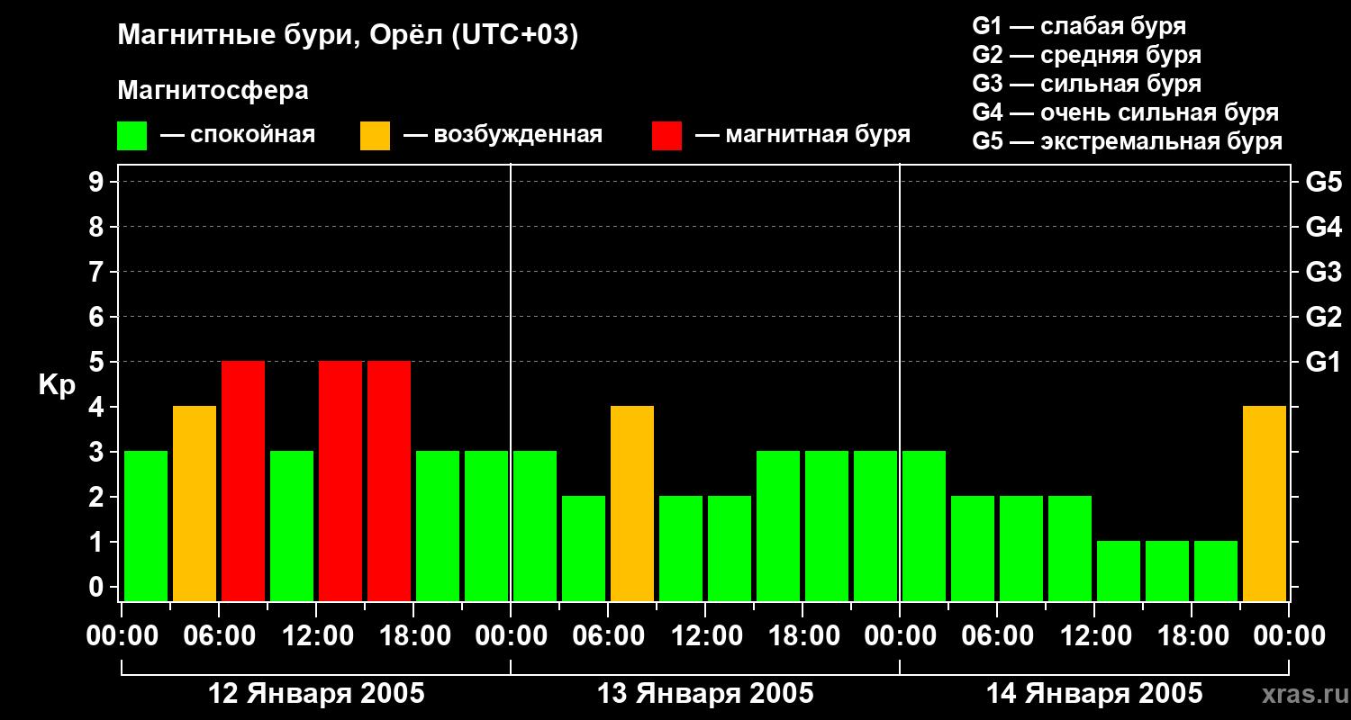 Изменения геомагнитного индекса Kp с 12 по 14 января 2005 года для средних широт