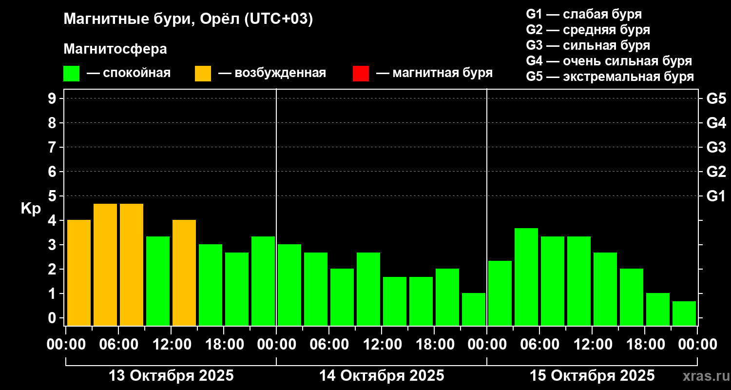 Изменения геомагнитного индекса Kp с 13 по 15 октября 2025 года для средних широт