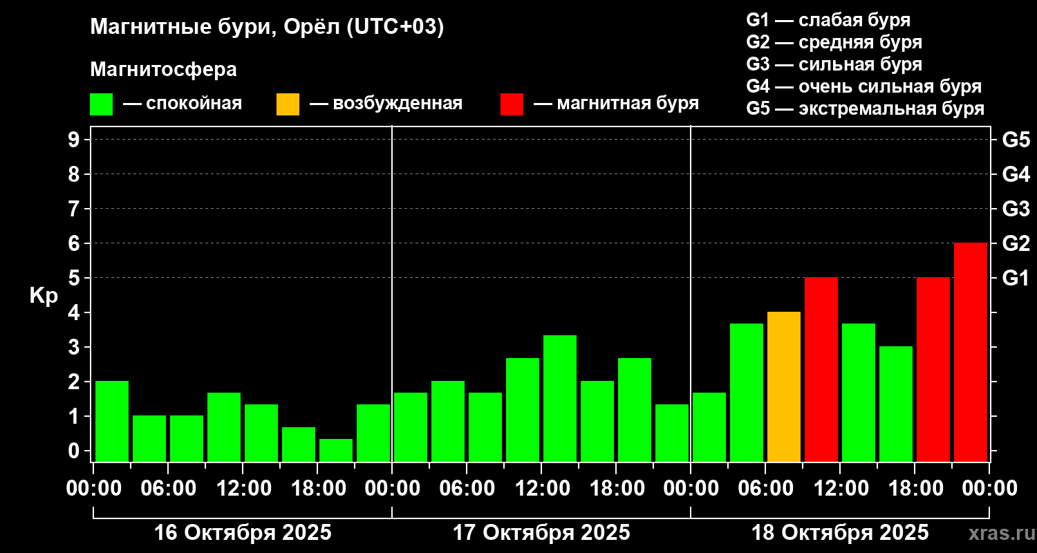 Изменения геомагнитного индекса Kp с 16 по 18 октября 2025 года для средних широт