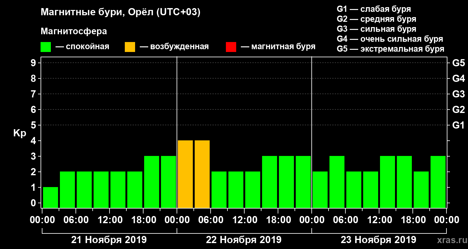 Изменения геомагнитного индекса Kp с 21 по 23 ноября 2019 года для средних широт