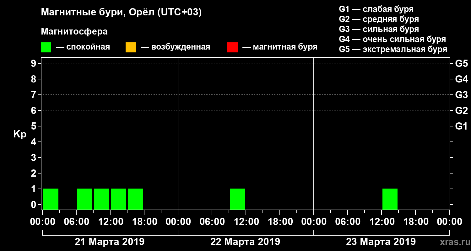 Изменения геомагнитного индекса Kp с 21 по 23 марта 2019 года для средних широт