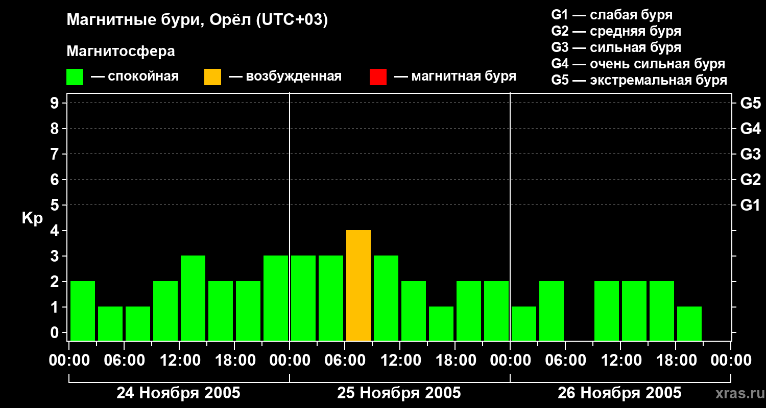 Изменения геомагнитного индекса Kp с 24 по 26 ноября 2005 года для средних широт