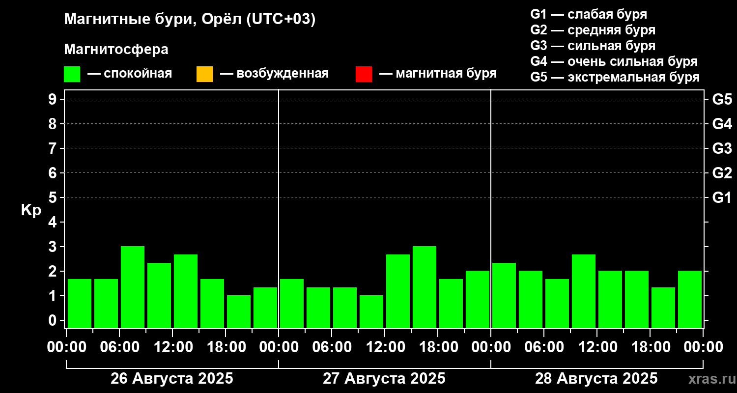 Изменения геомагнитного индекса Kp с 26 по 28 августа 2025 года для средних широт