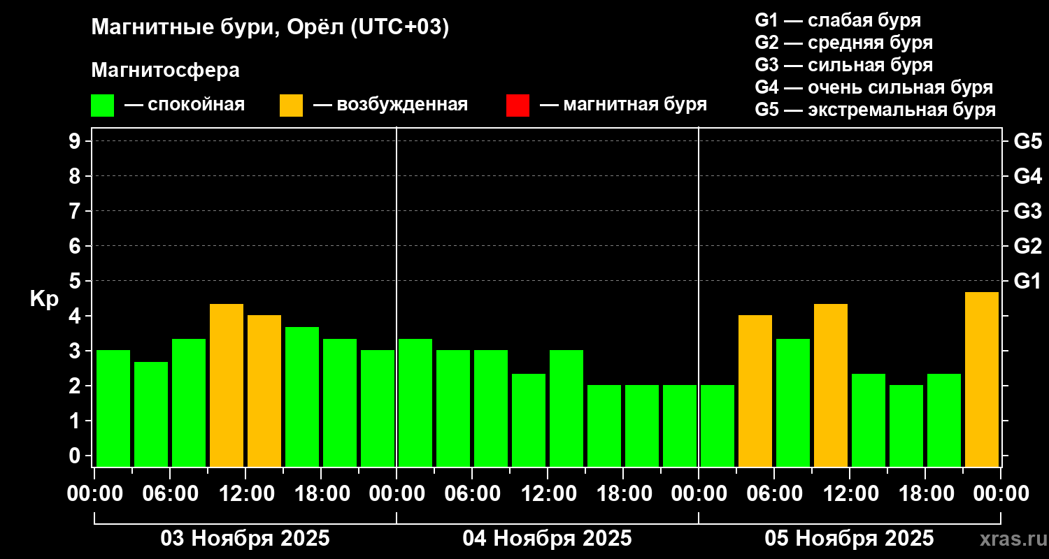Изменения геомагнитного индекса Kp с 3 по 5 ноября 2025 года для средних широт