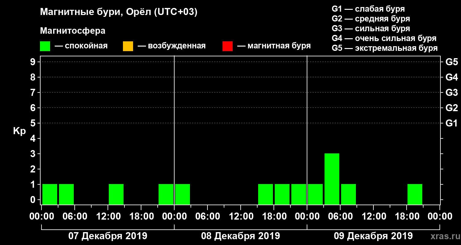 Изменения геомагнитного индекса Kp с 7 по 9 декабря 2019 года для средних широт