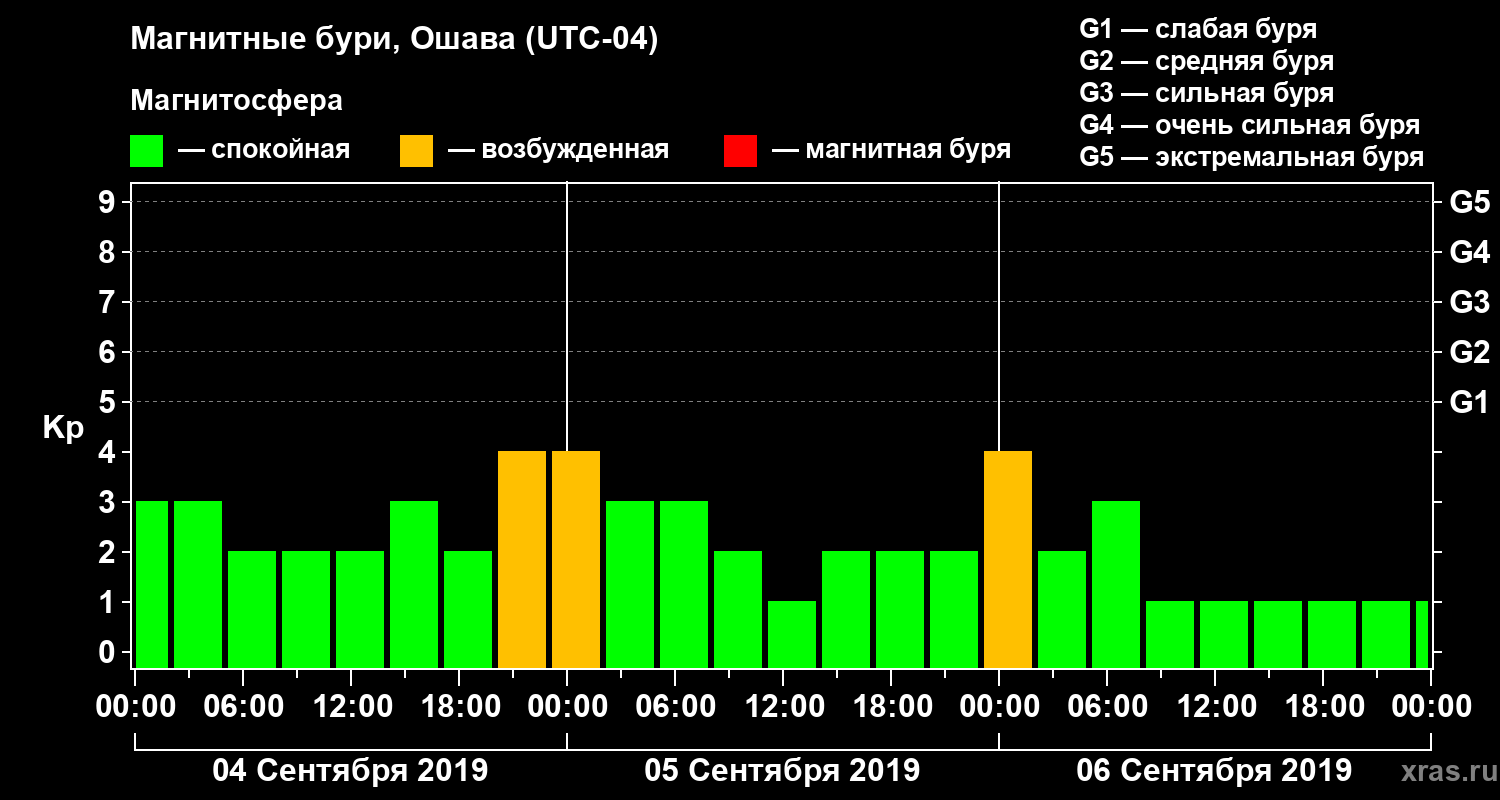 Изменения геомагнитного индекса Kp с 4 по 6 сентября 2019 года для средних широт