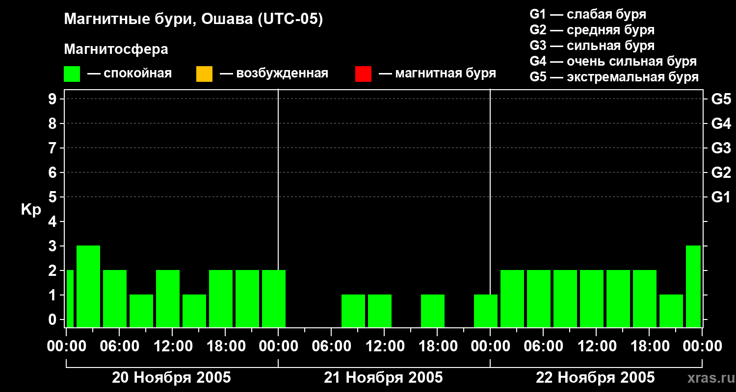 Изменения геомагнитного индекса Kp с 20 по 22 ноября 2005 года для средних широт