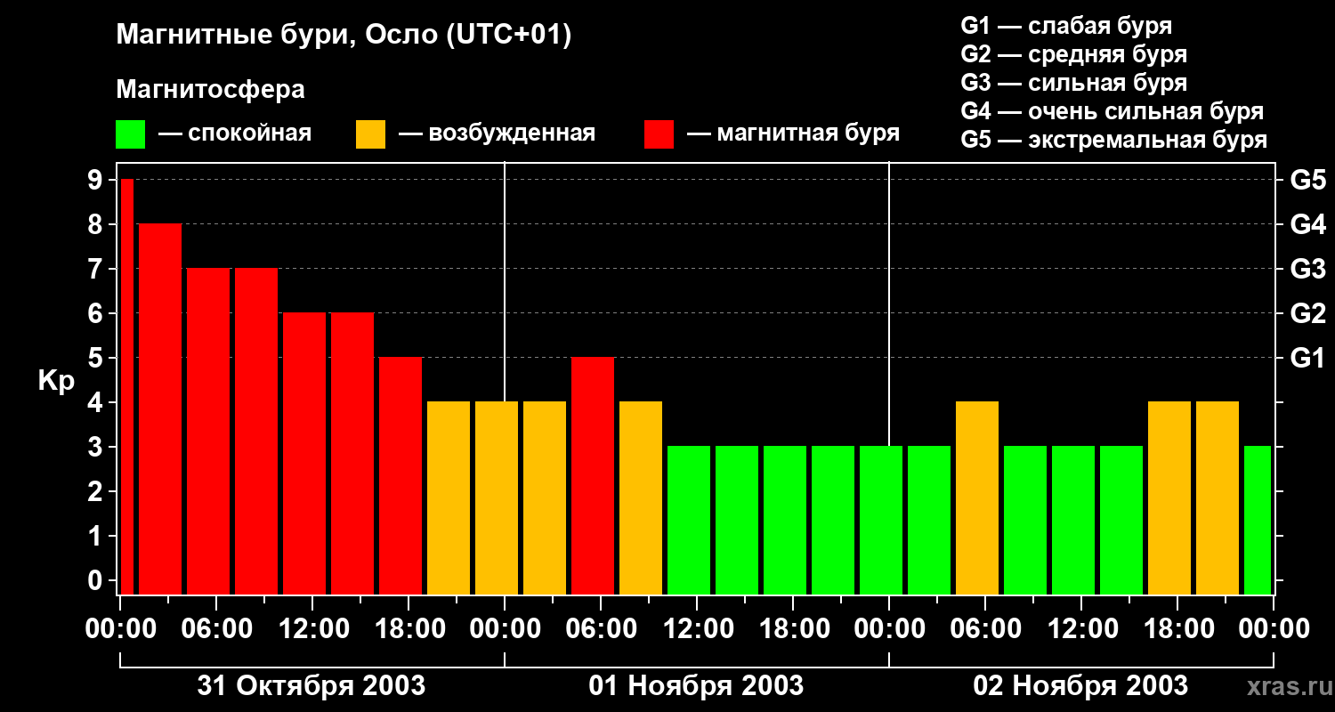 Изменения геомагнитного индекса Kp с 31 октября по 2 ноября 2003 года для средних широт