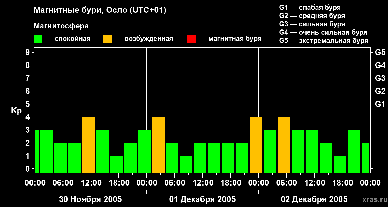Изменения геомагнитного индекса Kp с 30 ноября по 2 декабря 2005 года для средних широт