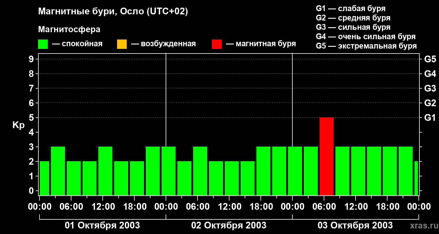 Изменения геомагнитного индекса Kp с 1 по 3 октября 2003 года для средних широт