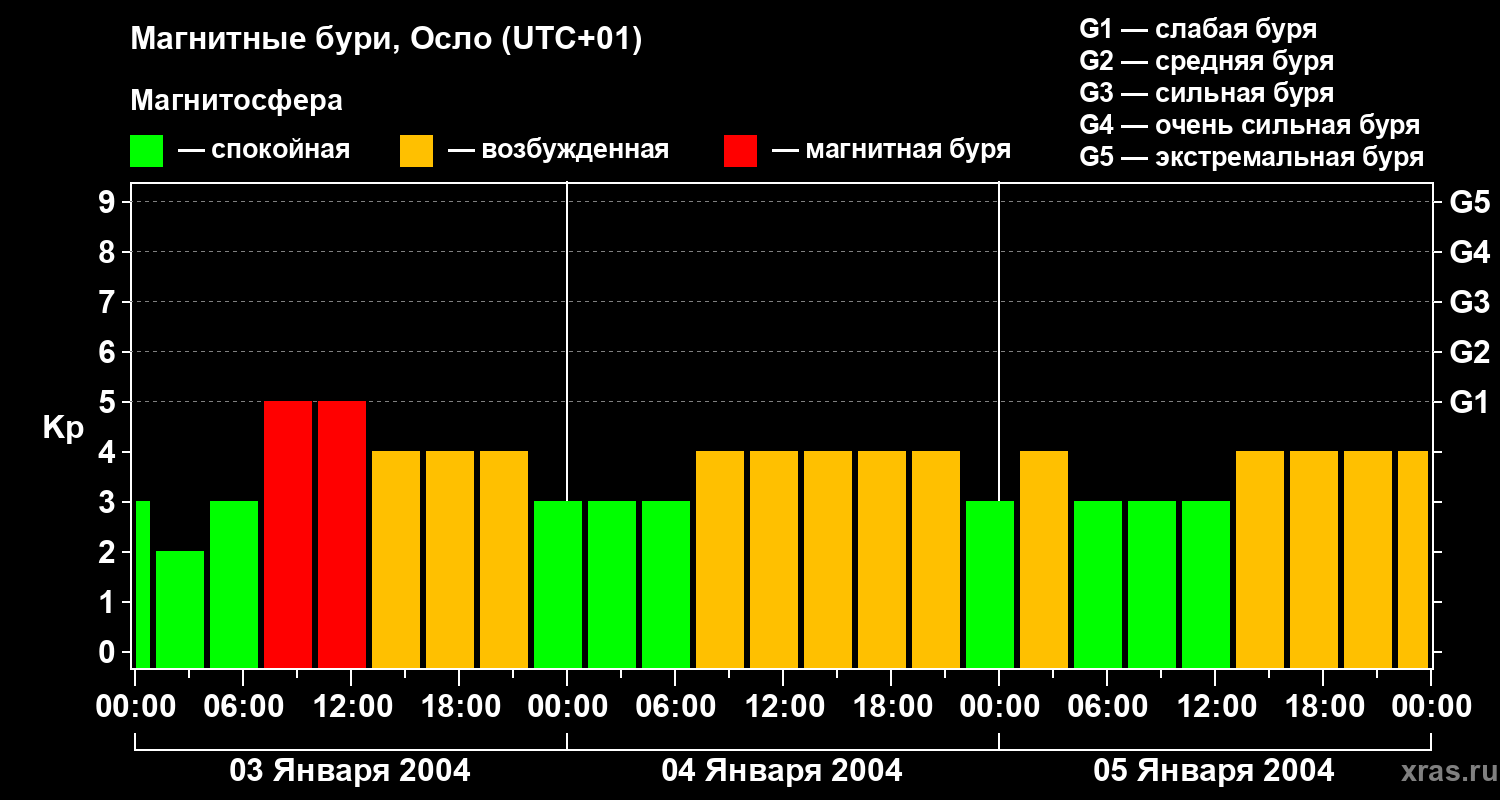 Изменения геомагнитного индекса Kp с 3 по 5 января 2004 года для средних широт