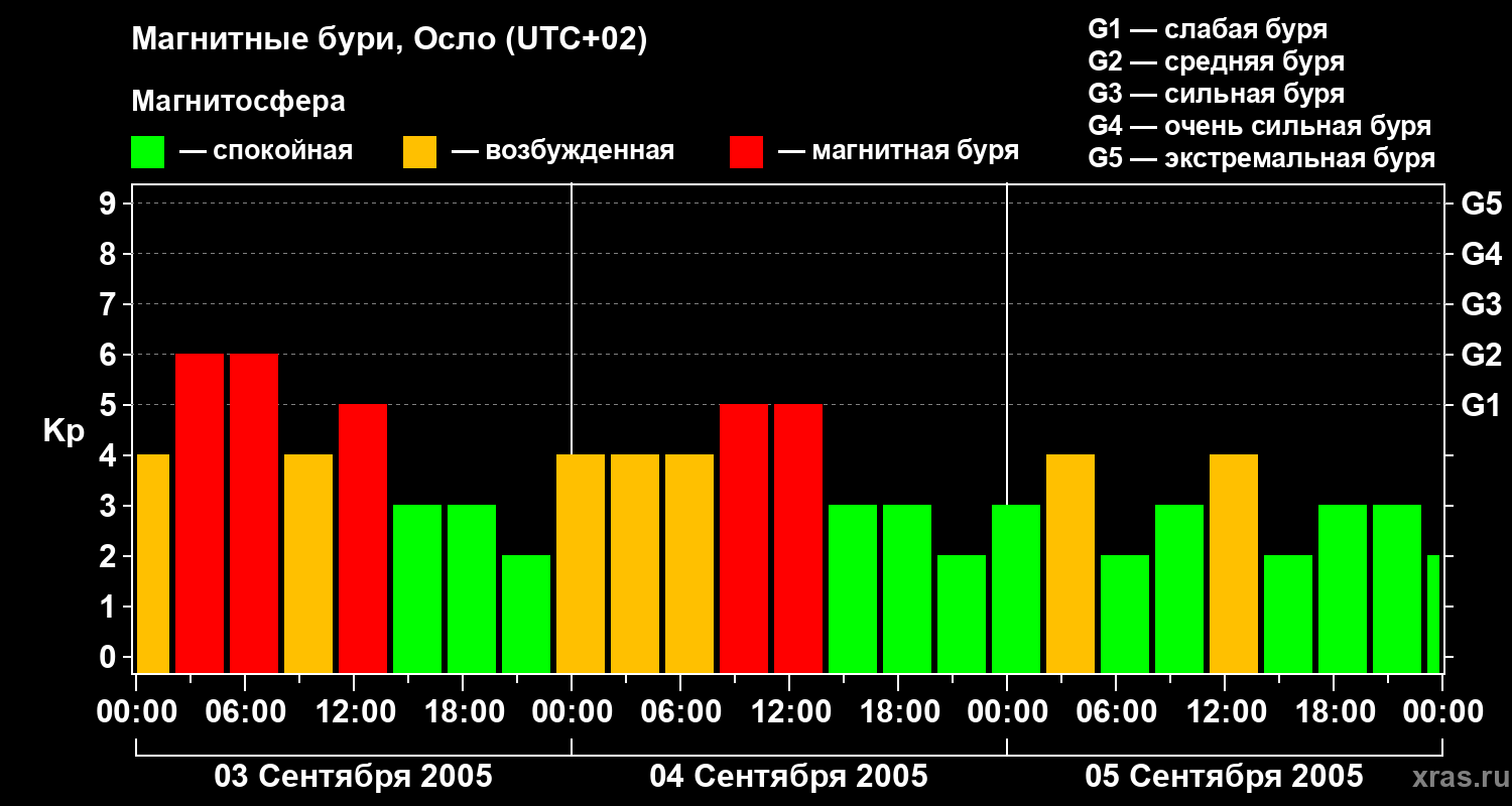Изменения геомагнитного индекса Kp с 3 по 5 сентября 2005 года для средних широт
