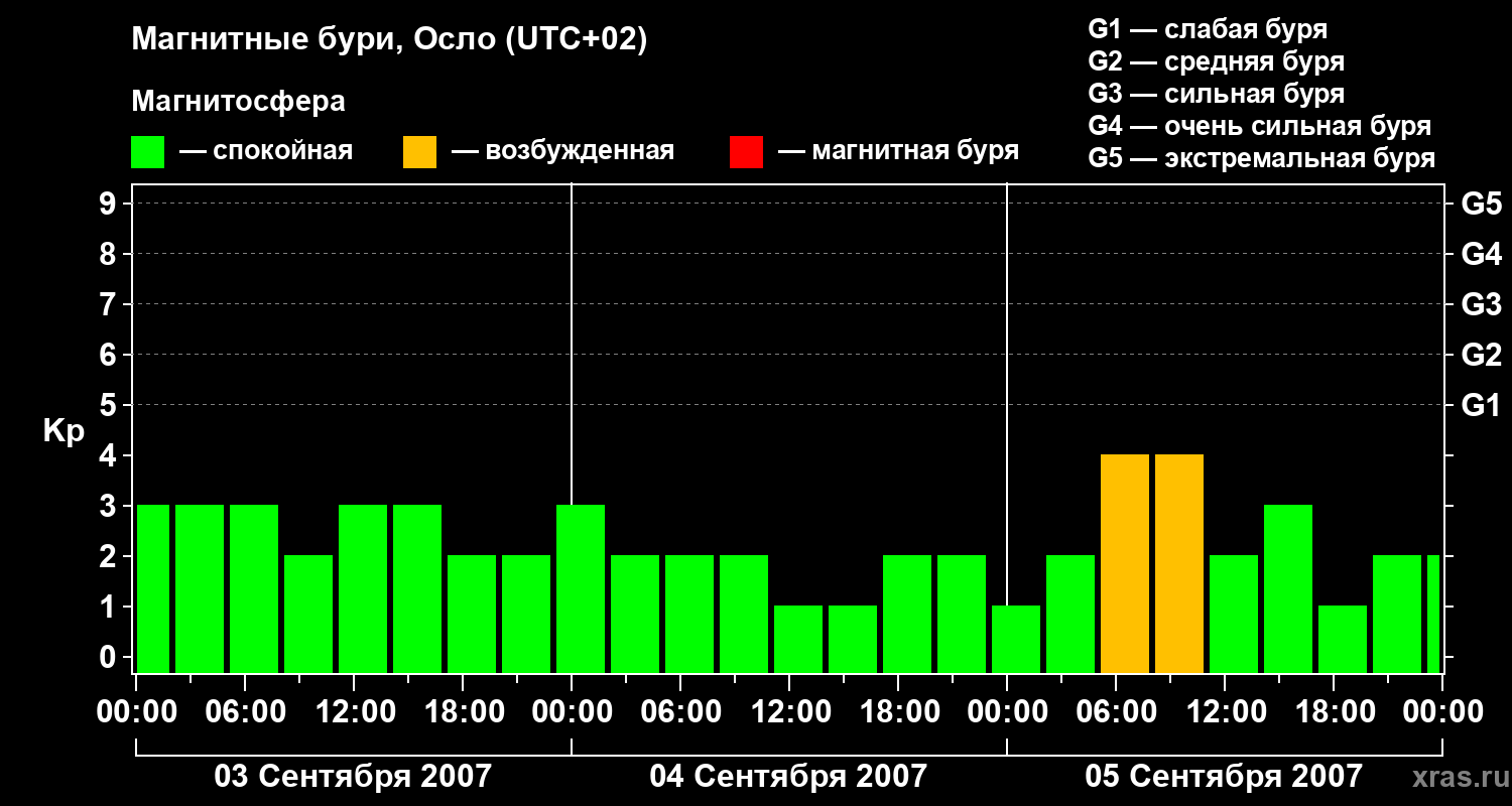 Изменения геомагнитного индекса Kp с 3 по 5 сентября 2007 года для средних широт