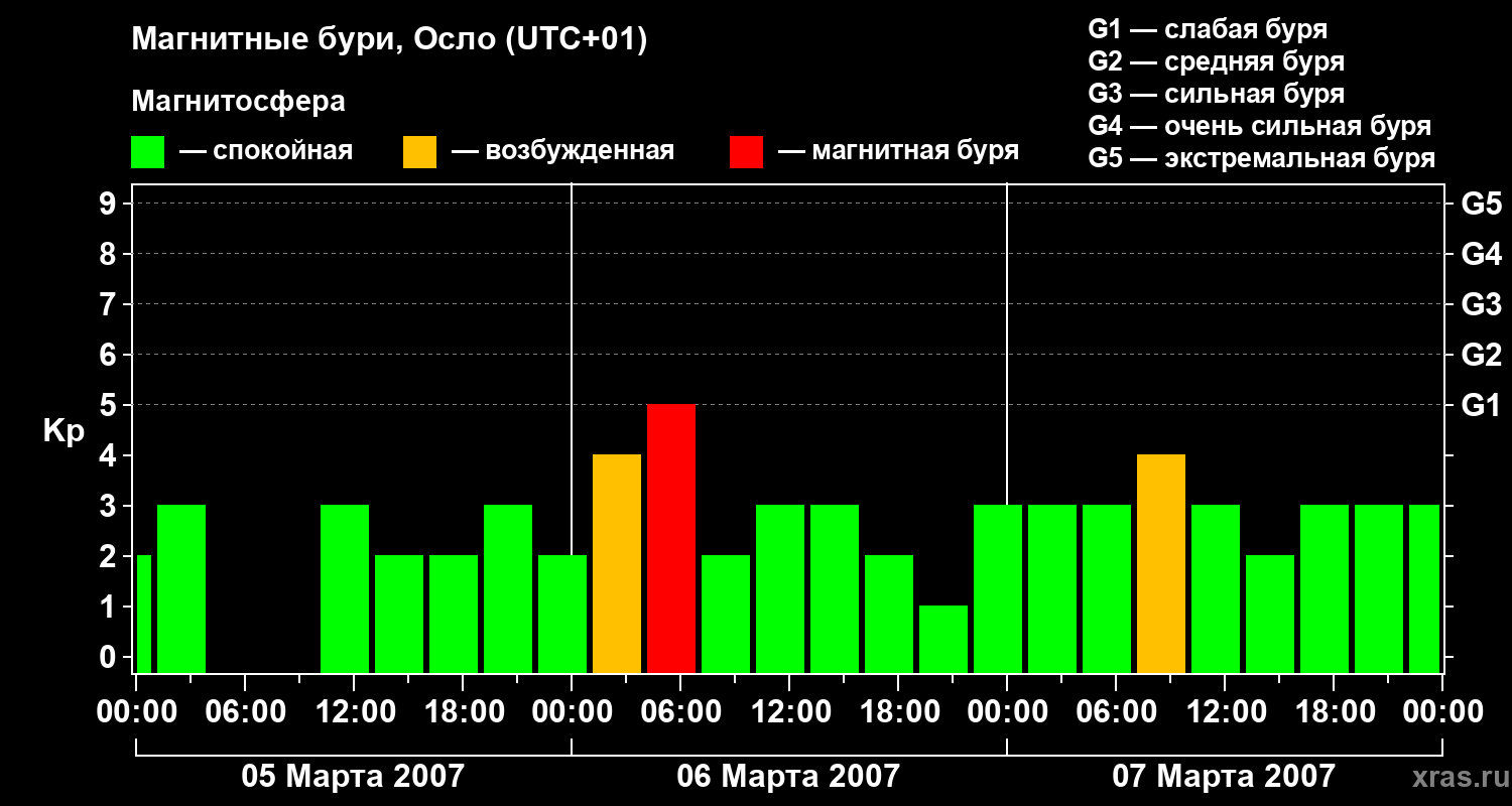 Изменения геомагнитного индекса Kp с 5 по 7 марта 2007 года для средних широт