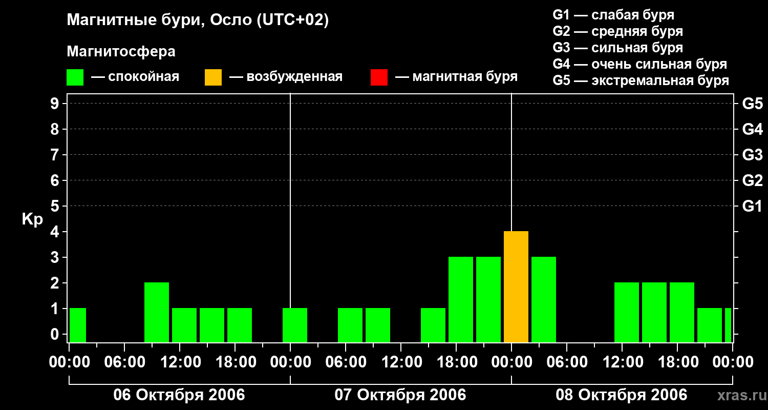 Изменения геомагнитного индекса Kp с 6 по 8 октября 2006 года для средних широт