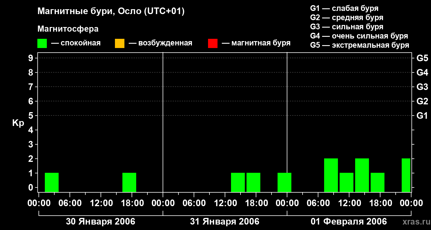 Изменения геомагнитного индекса Kp с 30 января по 1 февраля 2006 года для средних широт
