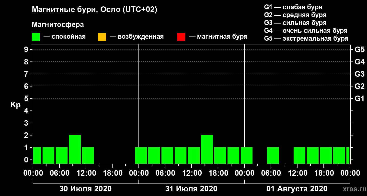 Изменения геомагнитного индекса Kp с 30 июля по 1 августа 2020 года для средних широт