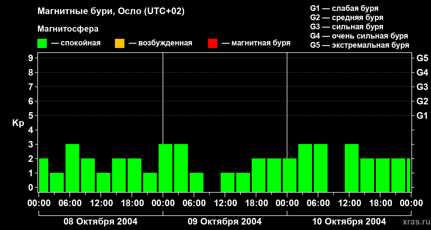 Изменения геомагнитного индекса Kp с 8 по 10 октября 2004 года для средних широт