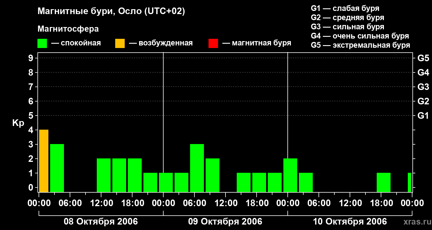 Изменения геомагнитного индекса Kp с 8 по 10 октября 2006 года для средних широт