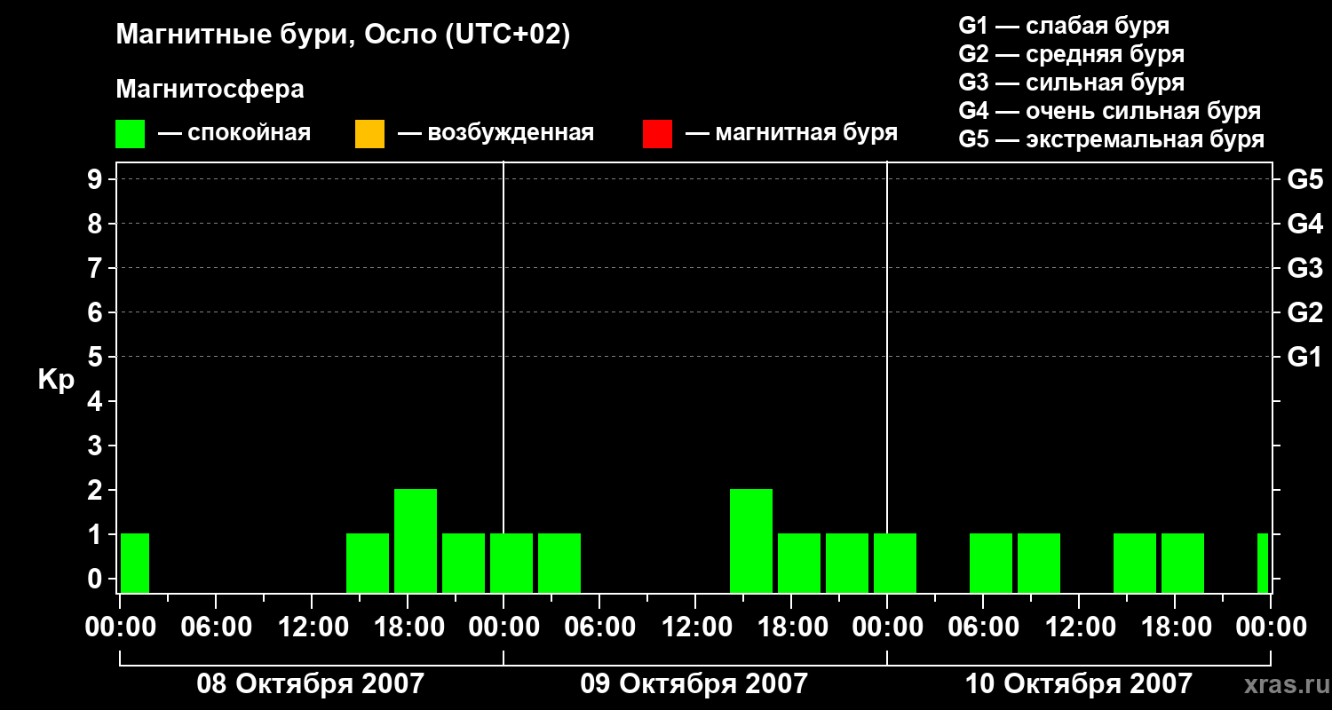 Изменения геомагнитного индекса Kp с 8 по 10 октября 2007 года для средних широт