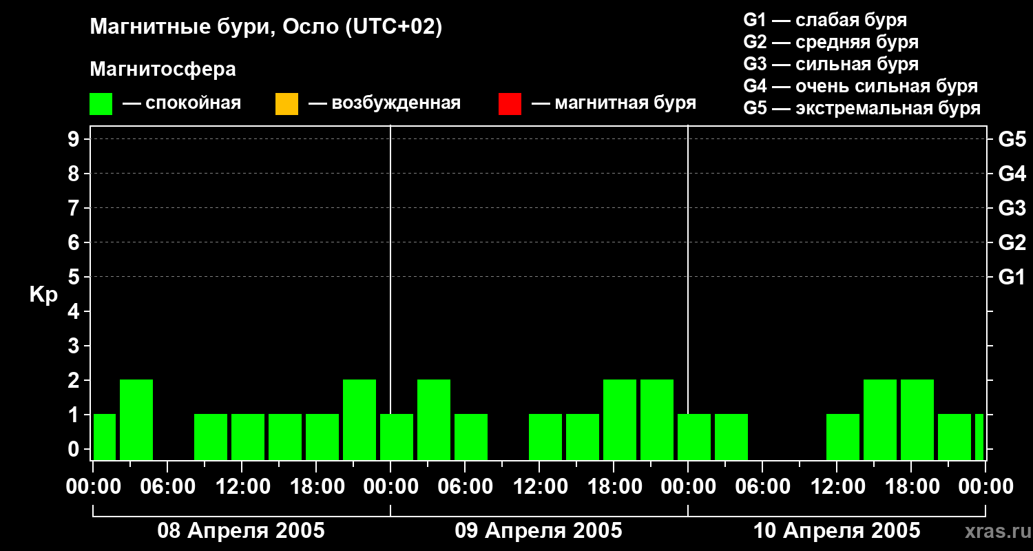 Изменения геомагнитного индекса Kp с 8 по 10 апреля 2005 года для средних широт
