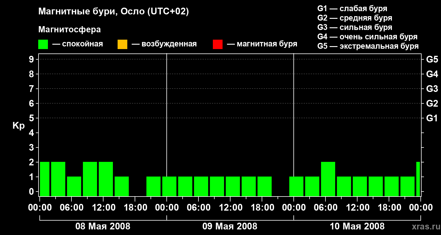 Изменения геомагнитного индекса Kp с 8 по 10 мая 2008 года для средних широт