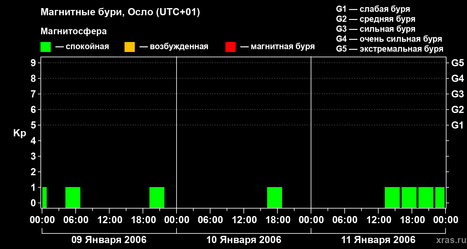 Изменения геомагнитного индекса Kp с 9 по 11 января 2006 года для средних широт