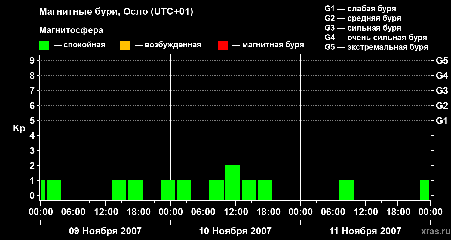 Изменения геомагнитного индекса Kp с 9 по 11 ноября 2007 года для средних широт