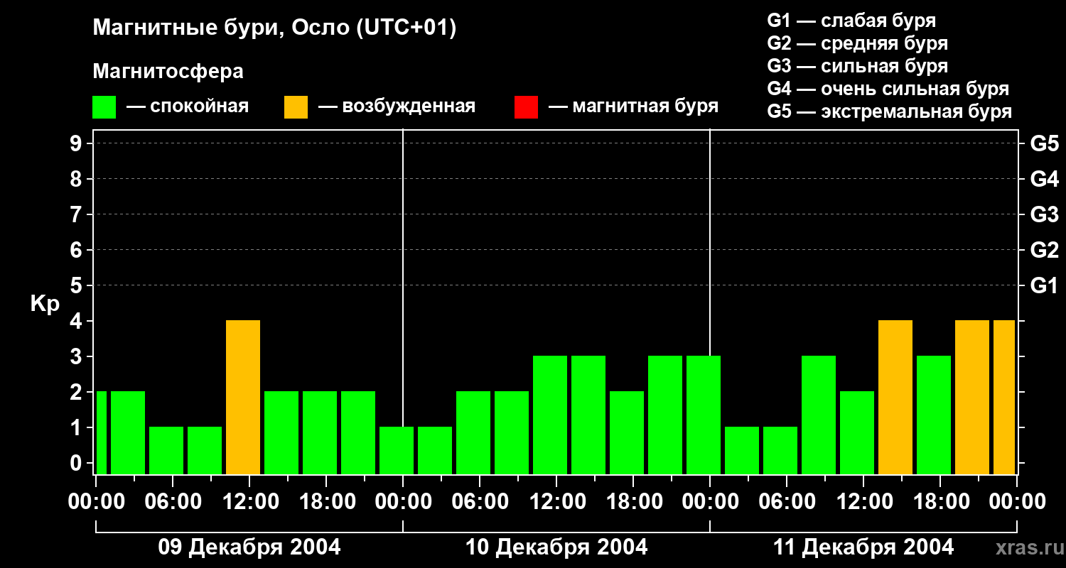 Изменения геомагнитного индекса Kp с 9 по 11 декабря 2004 года для средних широт