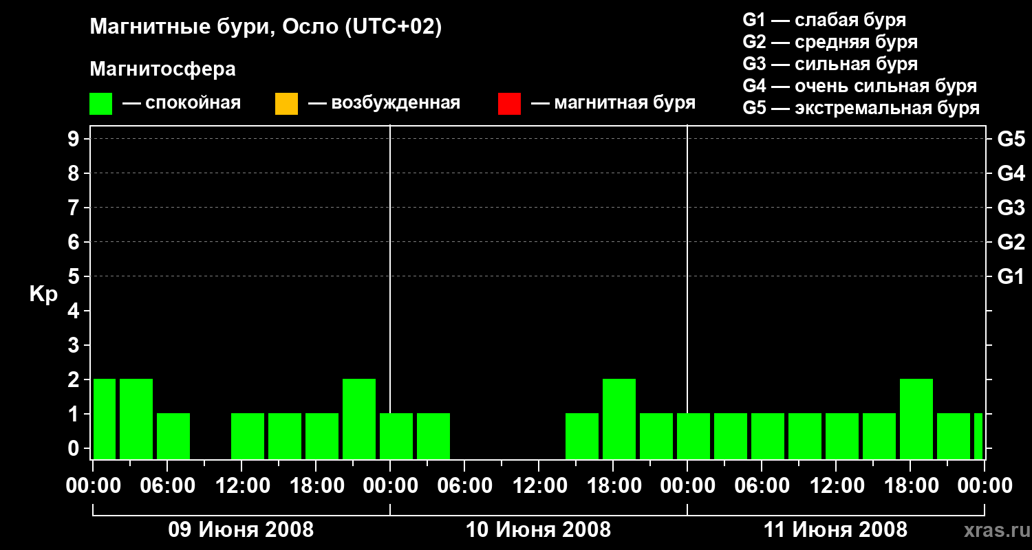 Изменения геомагнитного индекса Kp с 9 по 11 июня 2008 года для средних широт