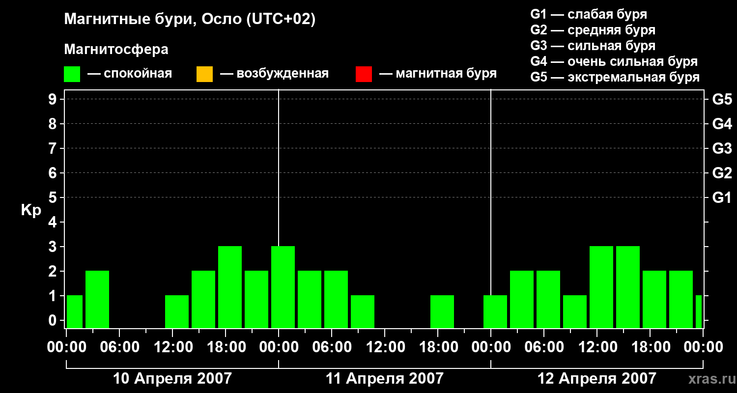 Изменения геомагнитного индекса Kp с 10 по 12 апреля 2007 года для средних широт