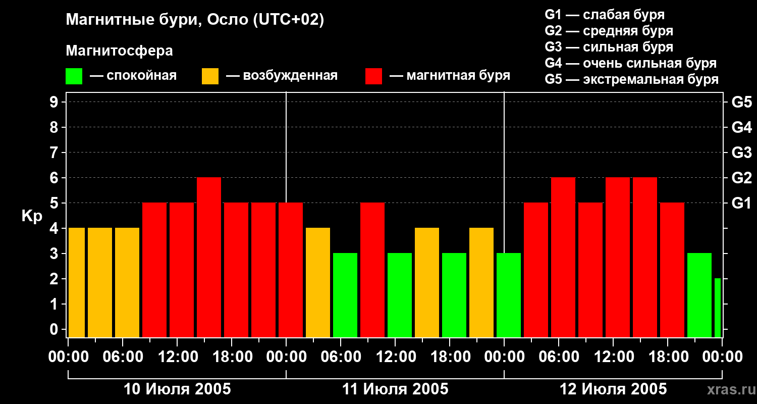 Изменения геомагнитного индекса Kp с 10 по 12 июля 2005 года для средних широт