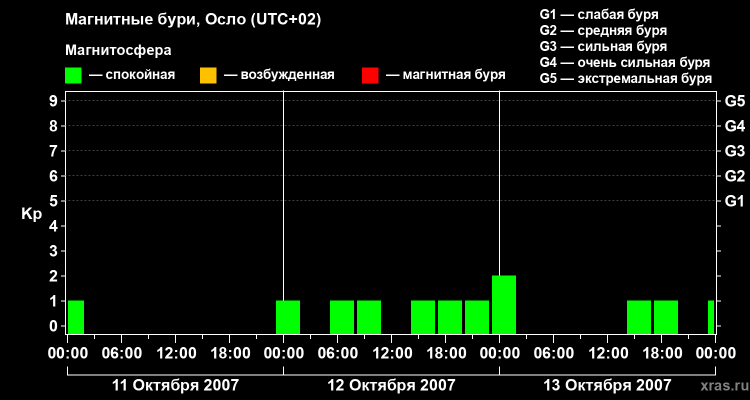 Изменения геомагнитного индекса Kp с 11 по 13 октября 2007 года для средних широт