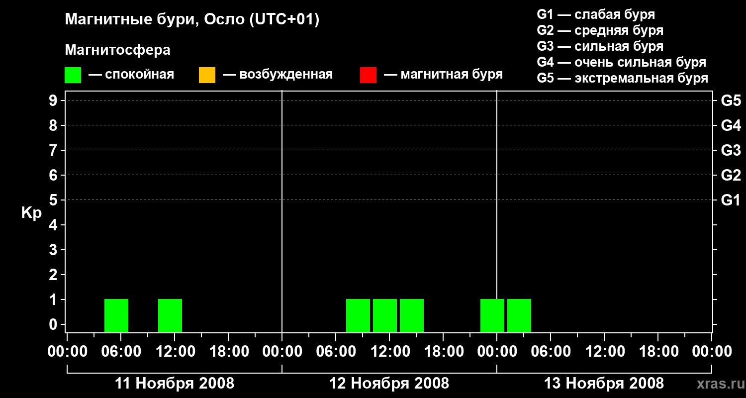 Изменения геомагнитного индекса Kp с 11 по 13 ноября 2008 года для средних широт