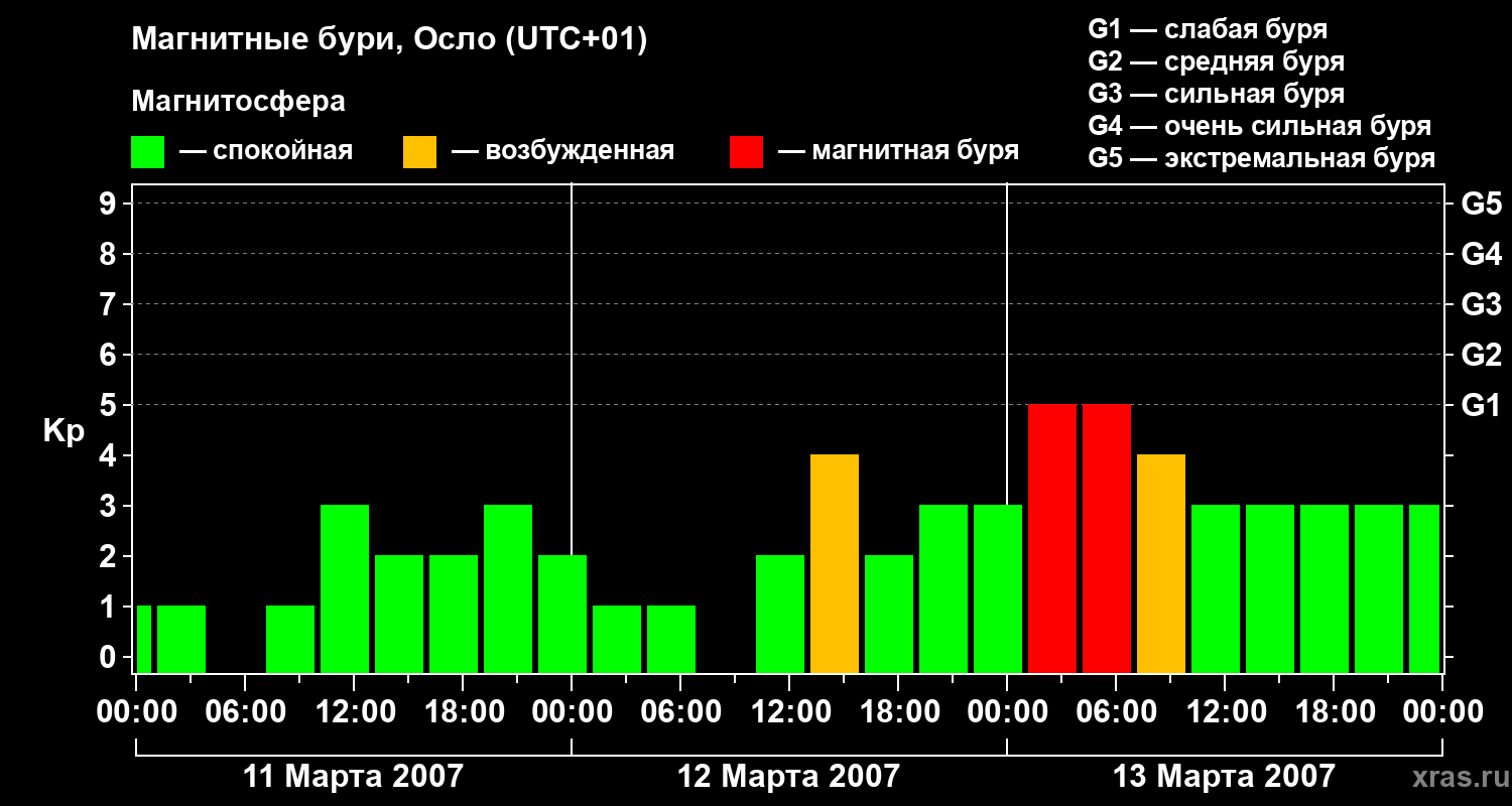 Изменения геомагнитного индекса Kp с 11 по 13 марта 2007 года для средних широт